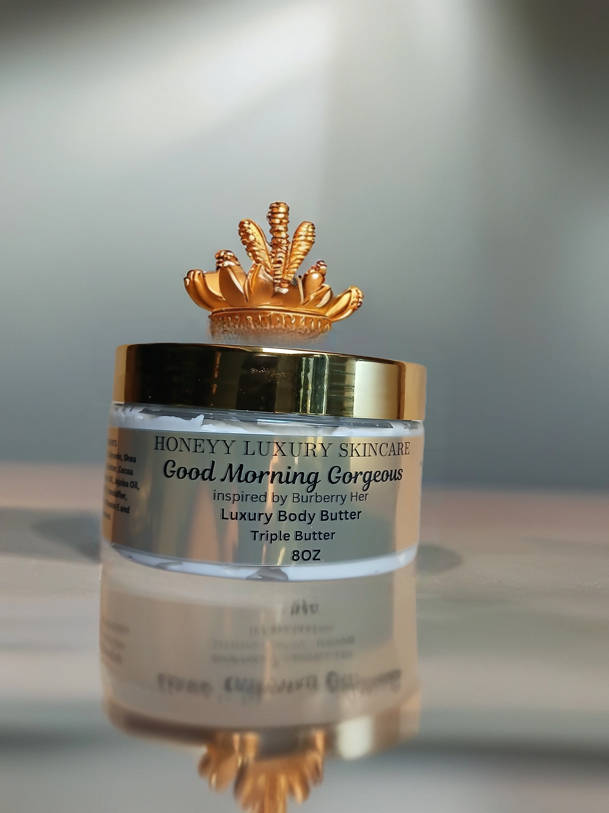 Experience the ultimate luxury with our Good Morning Gorgeous body butter inspired by Burberry Her. Indulge in its creamy texture and invigorating scent featuring notes of amber, vanilla and jasmine, while it moisturizes and nourishes your skin. Wake up feeling beautiful and ready to conquer the day with this bold addition to your daily routine.