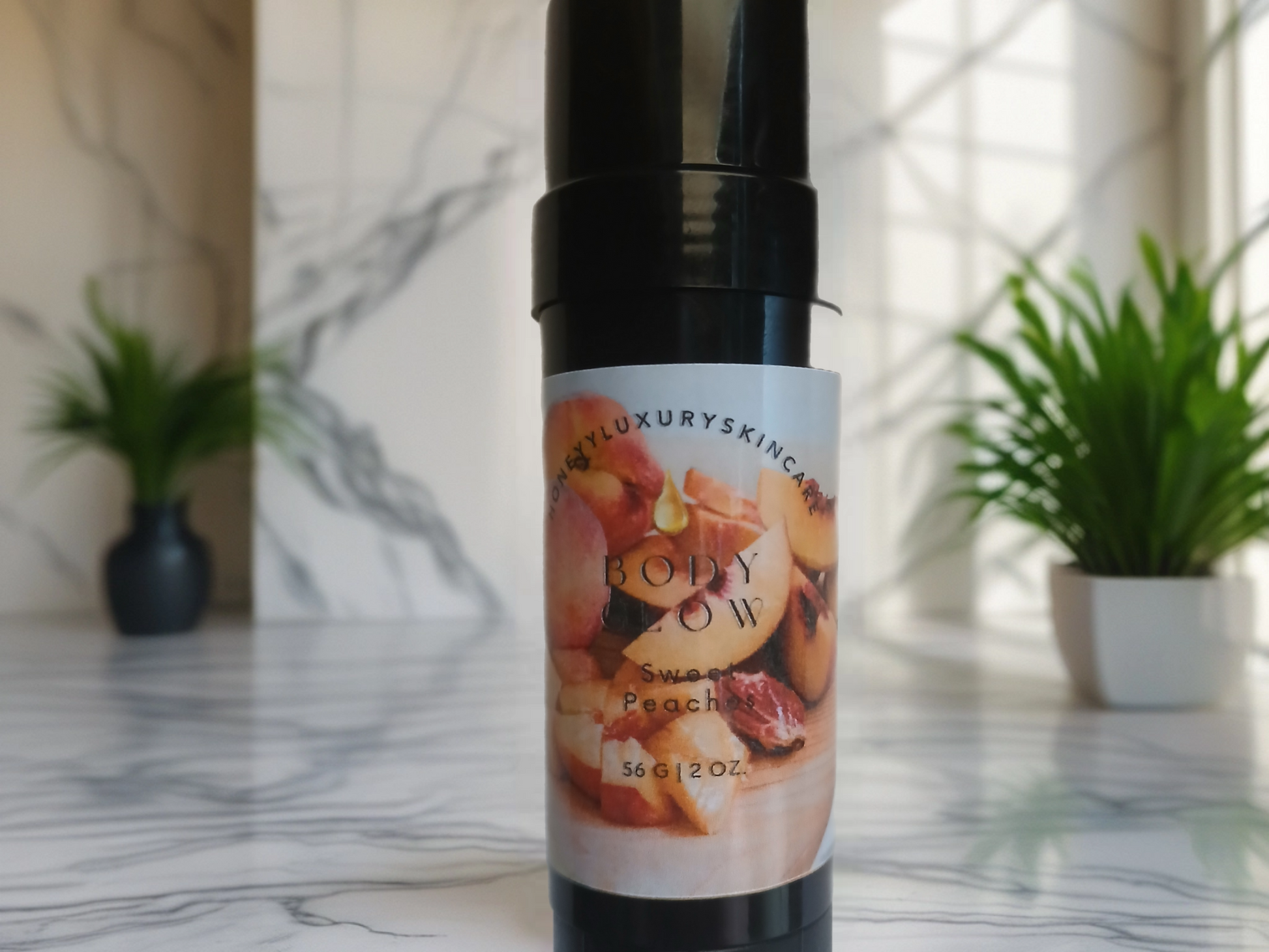 Get ready to shine with our Sweet Peaches Body Glow! This ultra-nourishing, peach-scented glazed oil is packed with skin-loving ingredients that leave you glowing and silky smooth. Infused with jojoba oil, vitamin E, and shea butter, it's the perfect way to hydrate your skin while adding a radiant, sun-kissed glow.